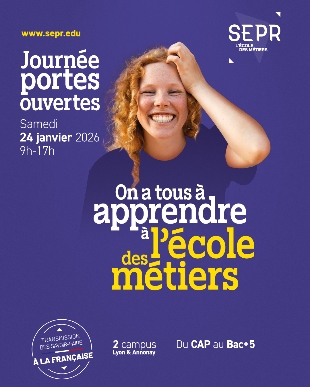 What if your future was decided this Saturday? This Saturday, January 24th, La SEPR, the school of trades, invites you to explore its campuses in Lyon and Annonay for a day of immersion into the world of vocational training. From 9 AM to 5 PM, come discover a wide range of training sectors, chat with passionate professionals, and dive into various trades to shape your project. The program includes discovering professions and pathways, visiting workshops and demonstrations, meeting trainers and learners, and receiving personalized advice to guide you in your orientation. It's the perfect opportunity to find the training that suits you.