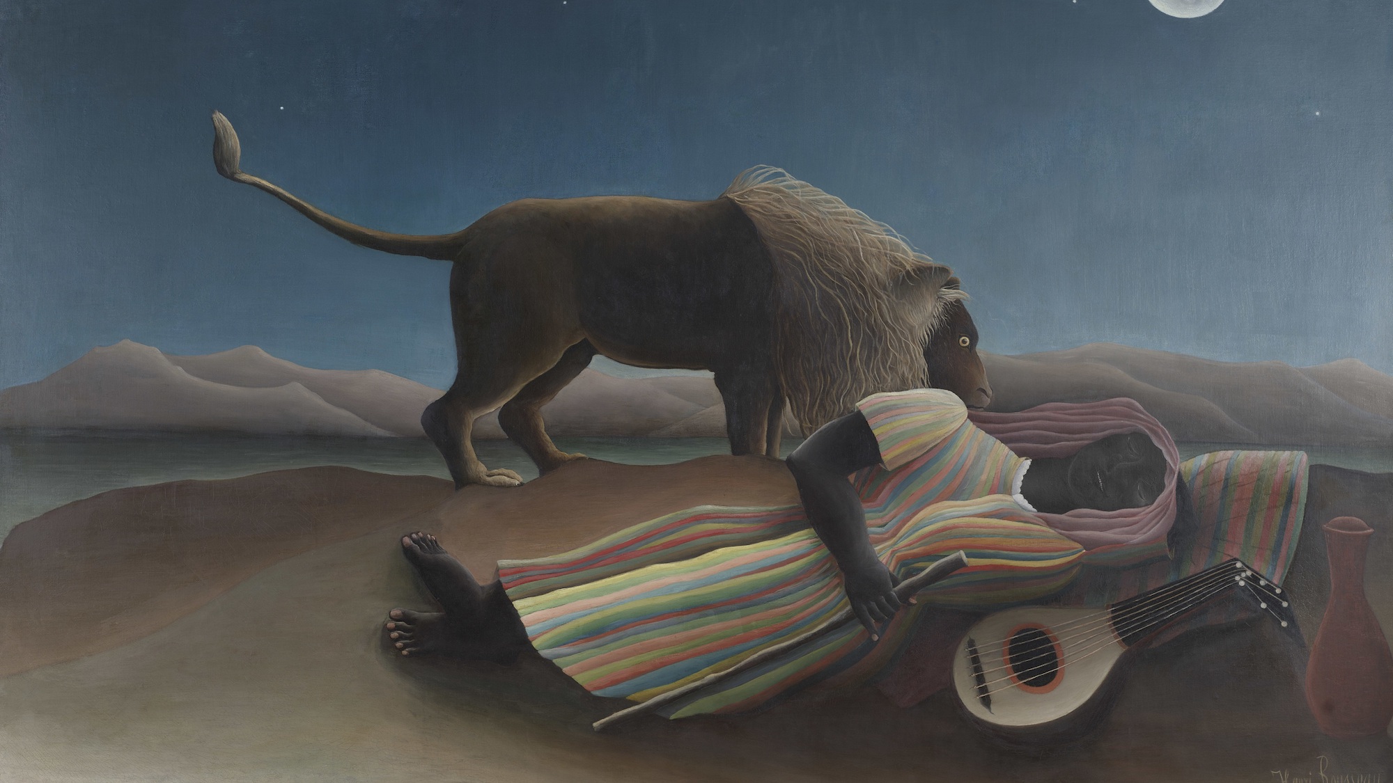 Highlight of the exhibition: The Sleeping Bohemian, loaned by the Museum of Modern Art in New York. A hypnotic canvas depicting a sleeping musician resting in a desert under the watchful gaze of a lion—this is the most emblematic image of the strange, poetic, and profoundly unique world of this eternal Rousseau.