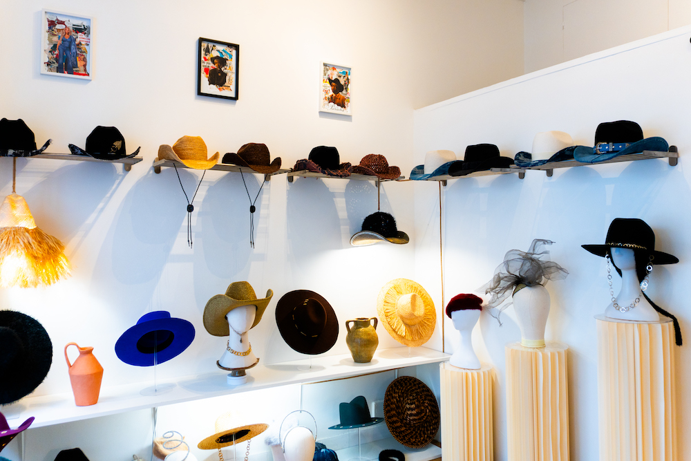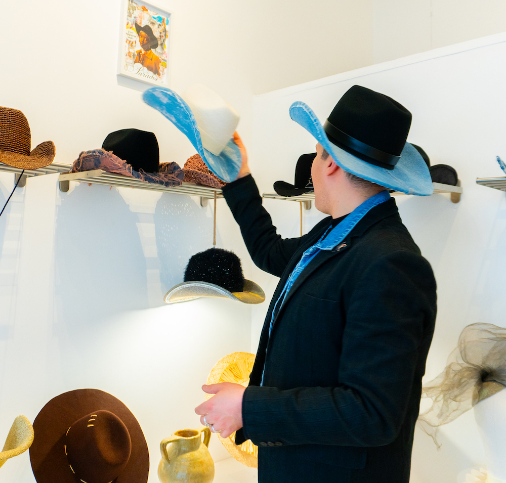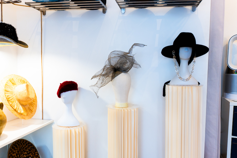 Cowboys — his favorite model — fascinators, berets, caps, in merino wool, felt, recycled fabric, or upcycled denim… The hats are carefully arranged one after the other on the shelves, like works of art in a gallery.