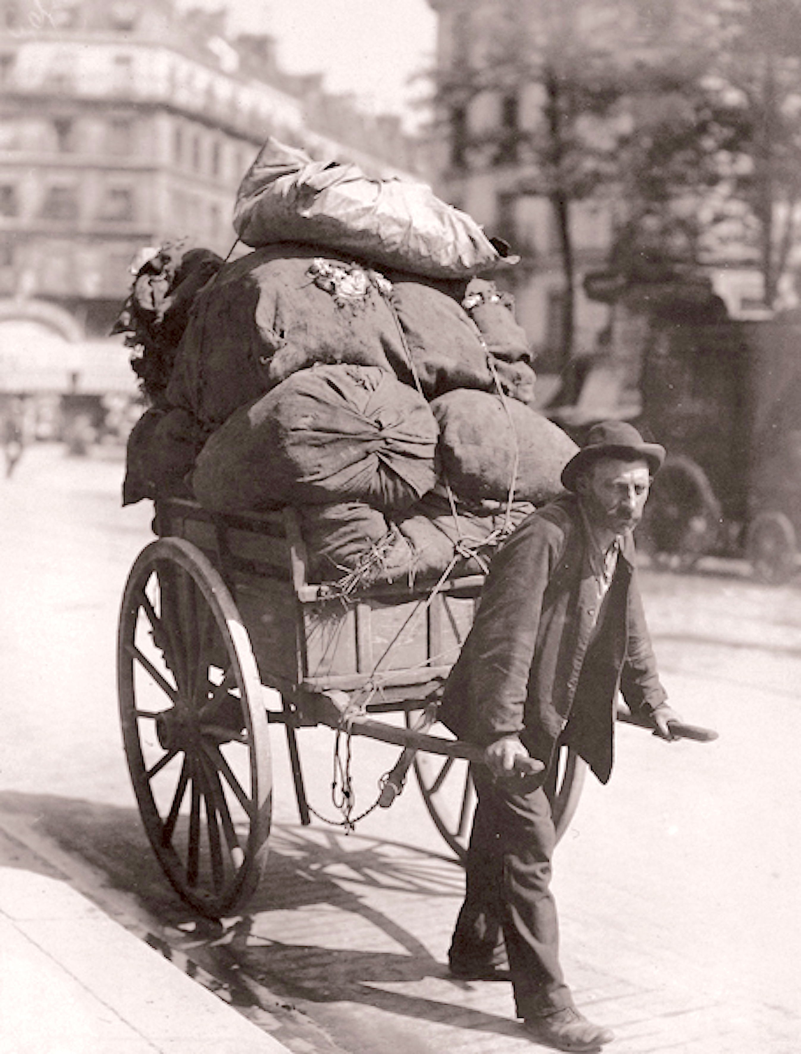 He was the essential figure on the streets of Paris, the 19th-century garbage collector. The ragman would collect used materials to sell them. Sunday's rabbit skins, rags, scrap metal—everything was piled up in his cart, which he dragged through the streets. This job faded from the Parisian scene with the establishment of the waste recovery system.